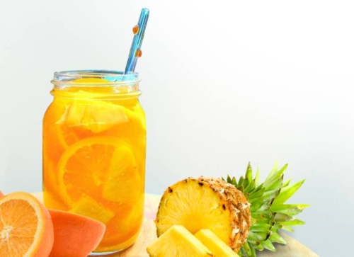 - Cho cam (lát hoặc nước) và dứa vào bình chứa 1 lít nước.