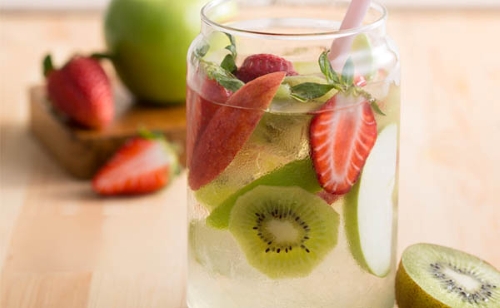 - Cho dâu tây và kiwi vào bình chứa 1 lít nước.