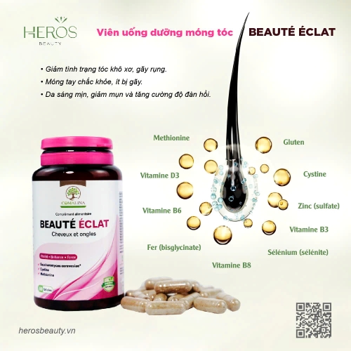 Với hơn 10 năm kinh nghiệm cùng sự nghiêm túc và tâm huyết với nghề, Heros Beauty luôn là địa chỉ tin cậy của các chị em phụ nữ trong hành trình chăm sóc và nuôi dưỡng tóc. Sản phẩm viên uống dưỡng móng tóc Beauté Éclat được nhập khẩu chính ngạch từ Pháp, dưới dạng viên nén, tiện lợi khi sử dụng.