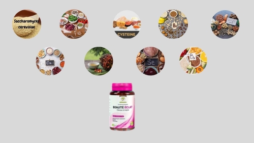 Các thành phần quan trọng của Beaute Eclat gồm: Levure de bière -saccharomyces cerevesiae (gluten, Cystine, Methionine, Extrait, Fer (bisglycinate),Zinc (sulfate) Vitamine B3, Cuivre (sulfate, Vitamine D3, Vitamine B6, Sélénium (sélénite) , Vitamine B8.