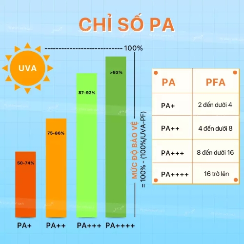 Chỉ số PA là viết tắt của “protection Grade of UVA”, là chỉ số do hiệp hội Mỹ phẩm Nhật Bản (JAC) công bố để đo lường khả năng bảo vệ da khỏi tác hại của tia UVA. Chỉ số này được thể hiện bằng các “+”, với PA là mức thấp nhất và PA++++ là mức cao nhất cho biết khả năng chống nắng tia UVA ở các mức độ khác nhau, giúp ngăn ngừa sạm nám, lão hóa da và nguy cơ ung thư da.