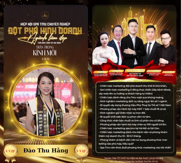 Tham gia sự kiện có chủ tịch Hiệp hội Spa TMU Nguyễn Anh Tuấn, các CEO giàu kinh nghiệm trong ngành: THẢO XINH, HUÂN PHẠM, NGUYỄN QUANG THẮNG, TRƯƠNG XUÂN TRƯỜNG sẽ giúp bạn giải quyết những băn khoăn, khúc mắc trong việc vận hành bộ máy marketing sao cho hiệu quả, các chiến lược giúp spa vượt qua khủng hoảng, thu về doanh thu bạc tỷ.
