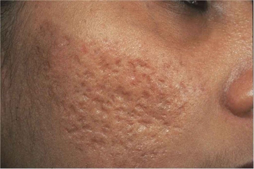 - Da vùng sẹo thô ráp, lỗ chân lông to, có thể kèm theo đỏ hoặc tăng sắc tố.
