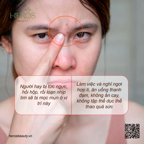 Nguyên nhân: Khi cơ thể cảm thấy bị tức ngực, hồi hộp, rối loạn nhịp tim cũng sẽ gây nên tình trạng mụn mọc giữa chân mày.