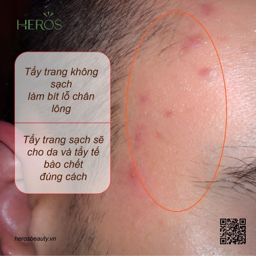 Nguyên nhân: Nguyên nhân gây nên mụn nội tiết ở vị trí chân tóc là do tẩy trang không sạch làm bít lỗ chân lông.